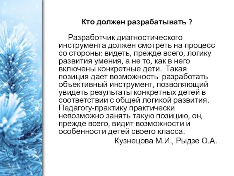 должен смотреть на процесс со стороны: видеть, прежде всего, логику развития умения, а не то, как в него включены конкретные дети. Такая позиция дает возможность разработать объективный инструмент, позволяющий увидеть результаты конкретных детей в соответствии с общей логикой развития. Педагогу-практику практически невозможно занять такую позицию, он, прежде всего, видит возможности и особенности детей своего класса.