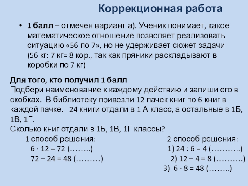 смог записать в виде верного математического выражения отношение между данными задачи. Это вызвано тем, что школьник не понимает смысла отношения «распределение по…» применительно к этой задаче или просто не представил себе ситуацию, описанную в задаче.