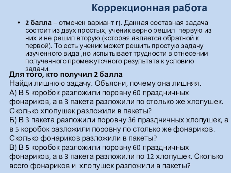 из двух простых, ученик верно решил первую из них и не решил вторую (которая является обратной к первой). То есть ученик может решить простую задачу изученного вида ,но испытывает трудности в отнесении полученного промежуточного результата к условию задачи.