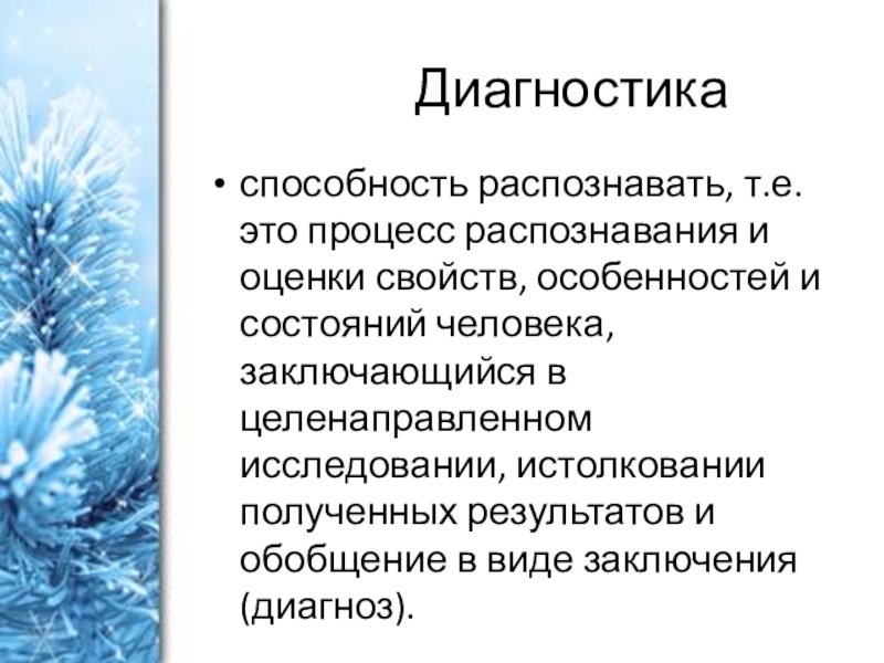 состояний человека, заключающийся в целенаправленном исследовании, истолковании полученных результатов и обобщение в виде заключения (диагноз).