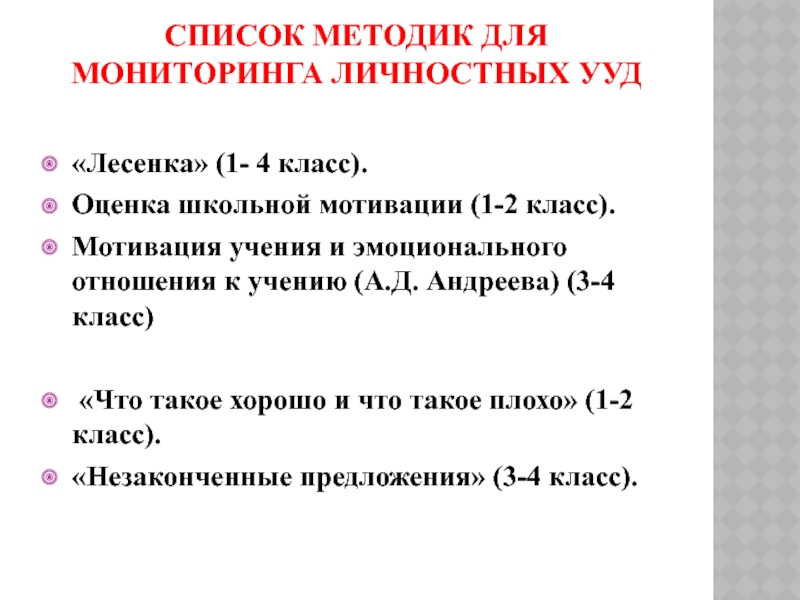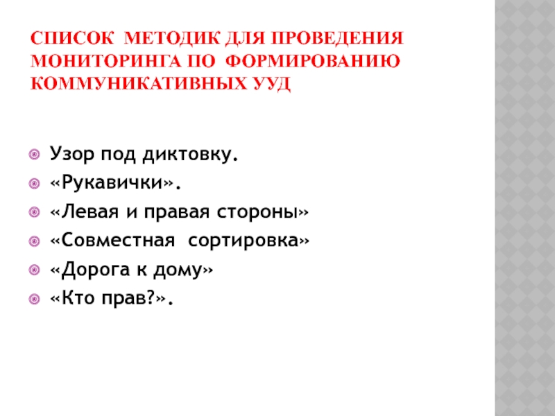 Слайд 20Список методик для проведения мониторинга по формированию коммуникативных УУД