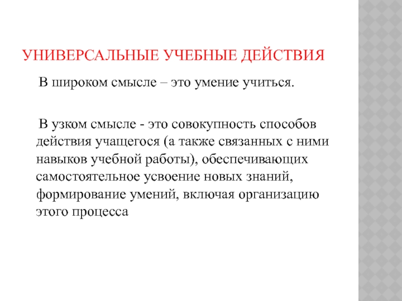 В узком смысле - это совокупность способов действия учащегося (а также связанных с ними навыков учебной работы), обеспечивающих самостоятельное усвоение новых знаний, формирование умений, включая организацию этого процесса
