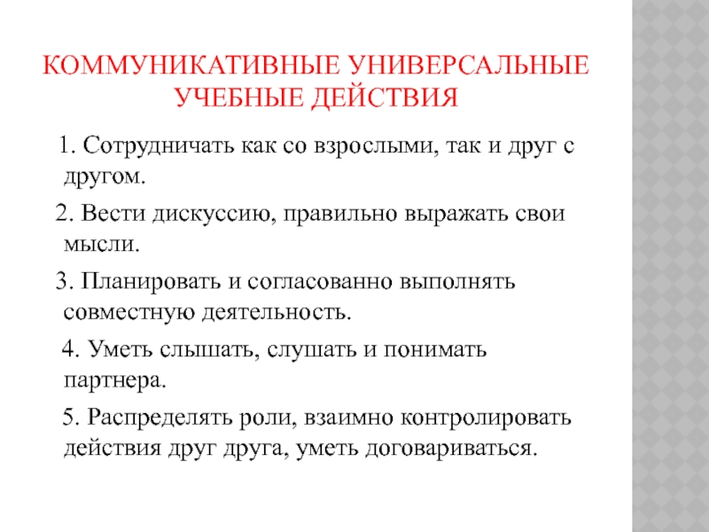 5. Распределять роли, взаимно контролировать действия друг друга, уметь договариваться.