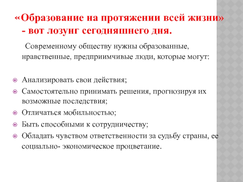 Слайд 2«Образование на протяжении всей жизни» - вот лозунг сегодняшнего дня.