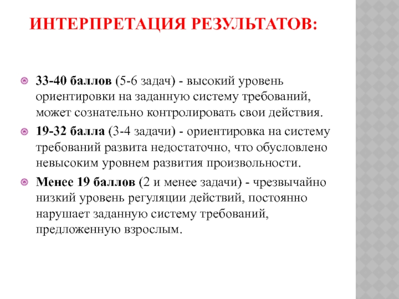 Менее 19 баллов (2 и менее задачи) - чрезвычайно низкий уровень регуляции действий, постоянно нарушает заданную систему требований, предложенную взрослым.