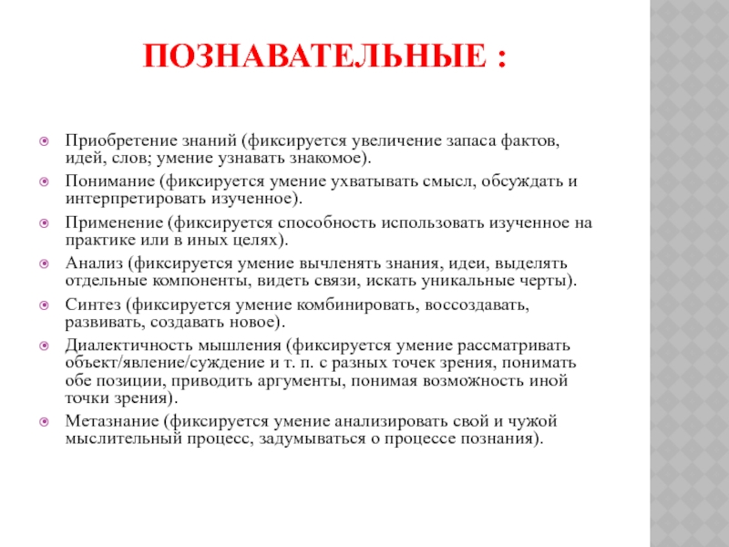 Приобретение знаний (фиксируется увеличение запаса фактов, идей, слов; умение узнавать