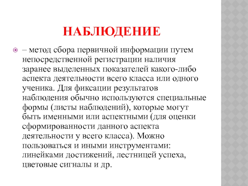 показателей какого-либо аспекта деятельности всего класса или одного ученика. Для фиксации результатов наблюдения обычно используются специальные формы (листы наблюдений), которые могут быть именными или аспектными (для оценки сформированности данного аспекта деятельности у всего класса). Можно пользоваться и иными инструментами: линейками достижений, лестницей успеха, цветовые сигналы и др.