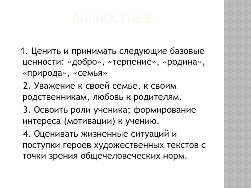 1. Ценить и принимать следующие базовые ценности: «добро», «терпение»,