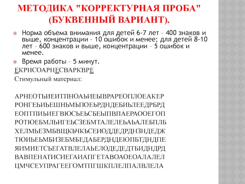 Слайд 30Методика "Корректурная проба" (буквенный вариант).