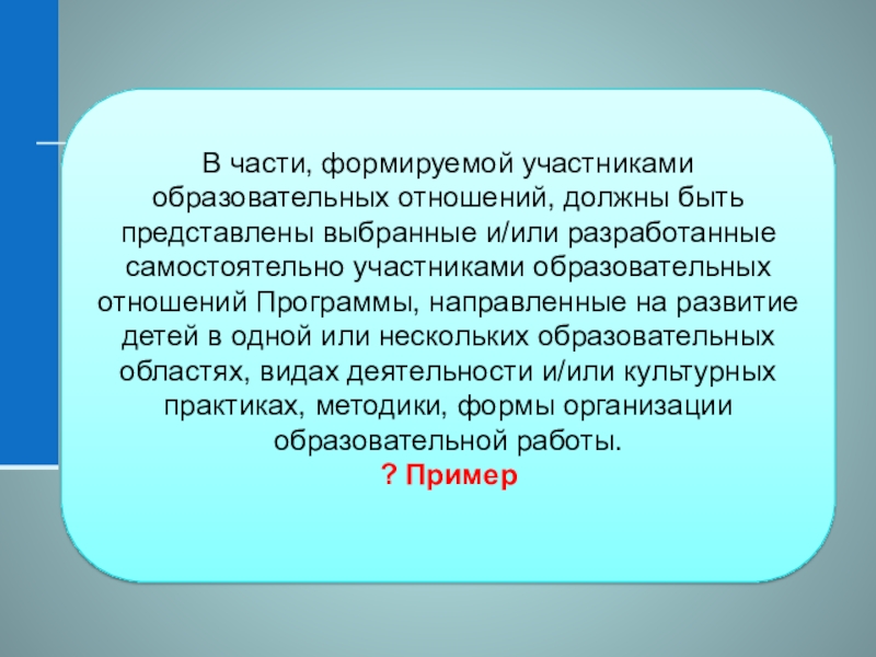 Слайд 17В части, формируемой участниками образовательных отношений, должны быть представлены выбранные и/или