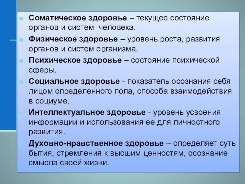 Соматическое здоровье – текущее состояние органов и систем человека.