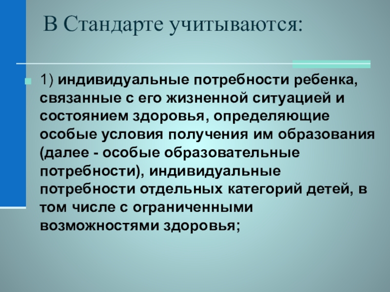 1) индивидуальные потребности ребенка, связанные с его жизненной ситуацией