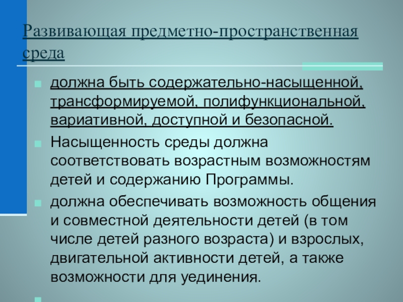 должна быть содержательно-насыщенной, трансформируемой, полифункциональной, вариативной, доступной и безопасной.