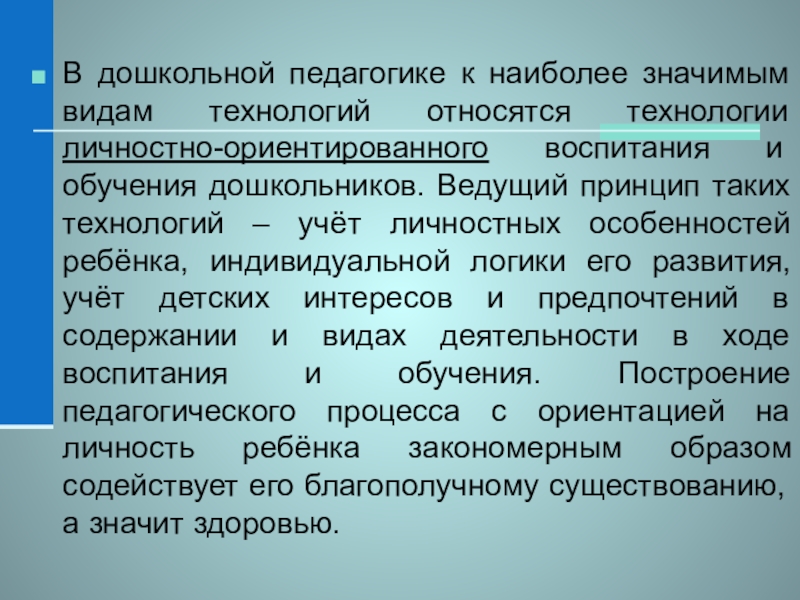 воспитания и обучения дошкольников. Ведущий принцип таких технологий – учёт личностных особенностей ребёнка, индивидуальной логики его развития, учёт детских интересов и предпочтений в содержании и видах деятельности в ходе воспитания и обучения. Построение педагогического процесса с ориентацией на личность ребёнка закономерным образом содействует его благополучному существованию, а значит здоровью.