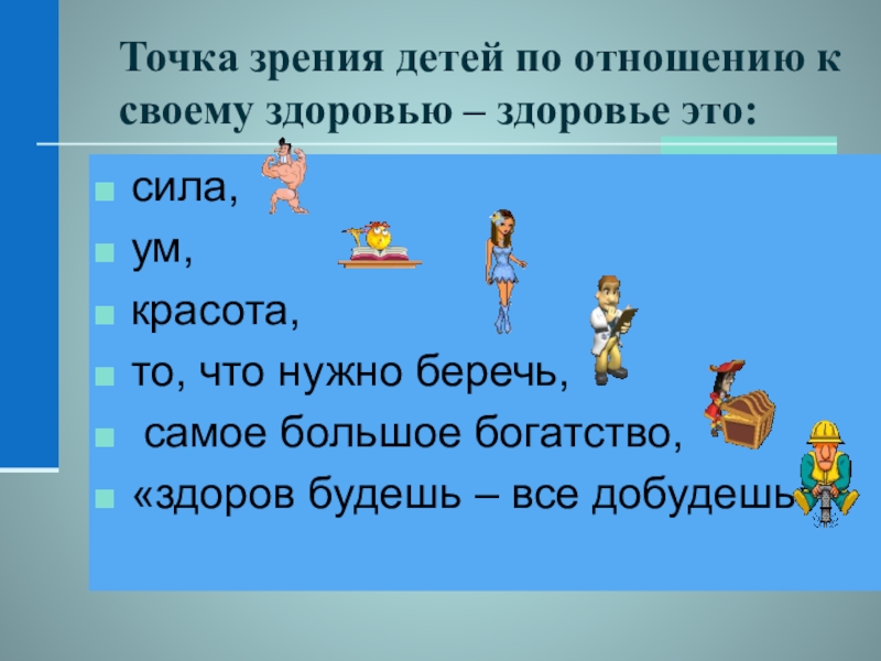Слайд 33Точка зрения детей по отношению к своему здоровью – здоровье это: