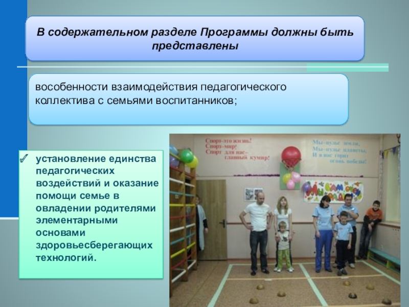 установление единства педагогических воздействий и оказание помощи семье в овладении родителями элементарными основами здоровьесберегающих технологий.