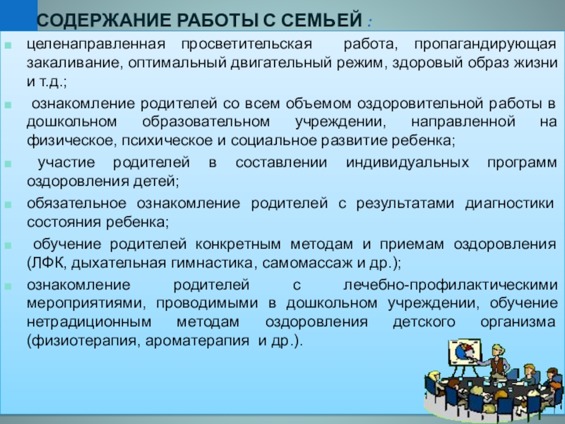 обучение родителей конкретным методам и приемам оздоровления (ЛФК, дыхательная гимнастика, самомассаж и др.);