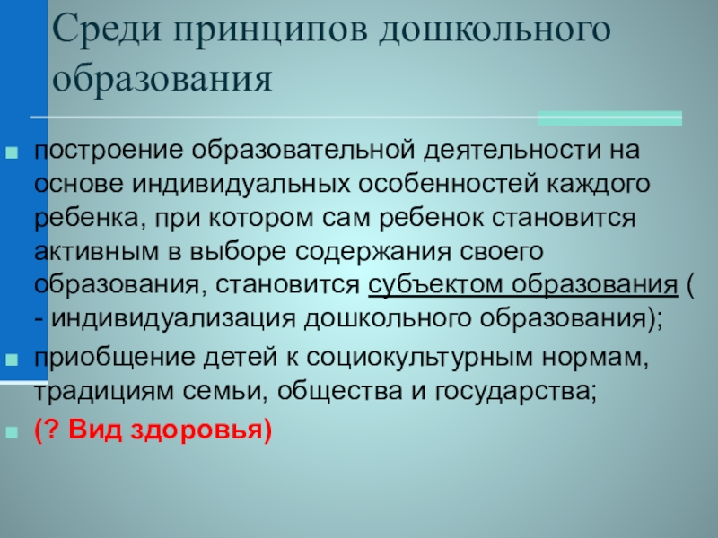 Слайд 7Среди принципов дошкольного образования