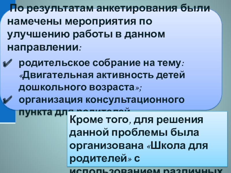 Слайд 24 По результатам анкетирования были намечены мероприятия по улучшению работы в