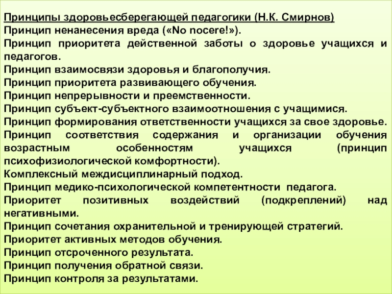 Принципы здоровьесберегающей педагогики (Н.К. Смирнов)