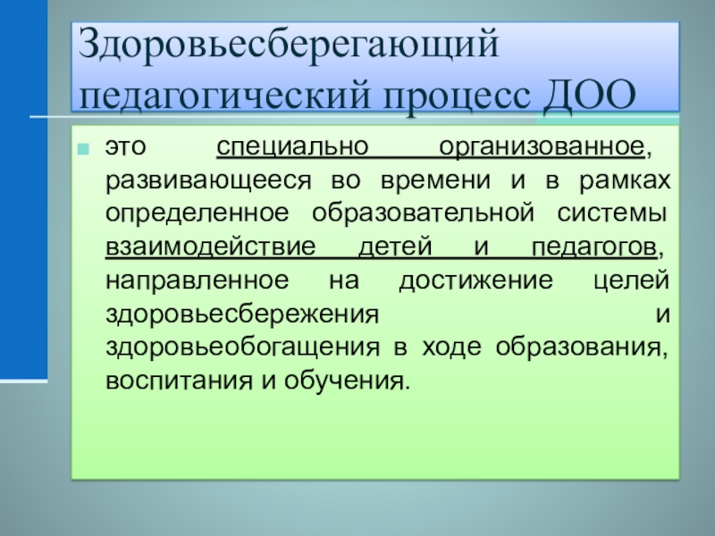 рамках определенное образовательной системы взаимодействие детей и педагогов, направленное на достижение целей здоровьесбережения и здоровьеобогащения в ходе образования, воспитания и обучения.