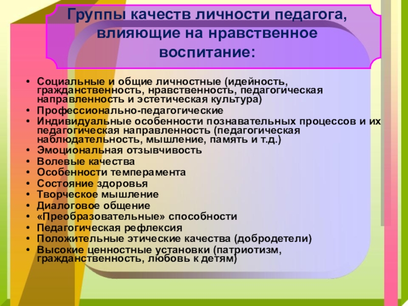 Группы качеств личности педагога, влияющие на нравственное воспитание: