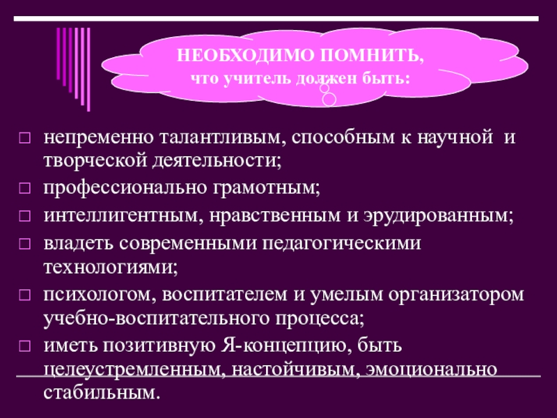 НЕОБХОДИМО ПОМНИТЬ, что учитель должен быть: