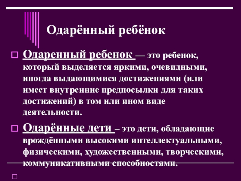 Одарённые дети – это дети, обладающие врождёнными высокими интеллектуальными, физическими, художественными, творческими, коммуникативными способностями.