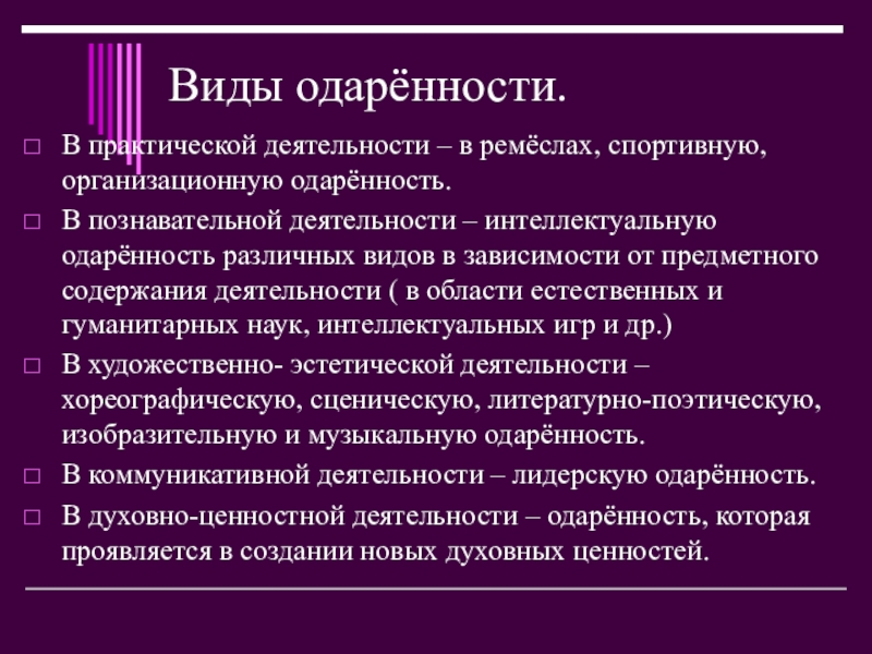 деятельности – интеллектуальную одарённость различных видов в зависимости от предметного содержания деятельности ( в области естественных и гуманитарных наук, интеллектуальных игр и др.)