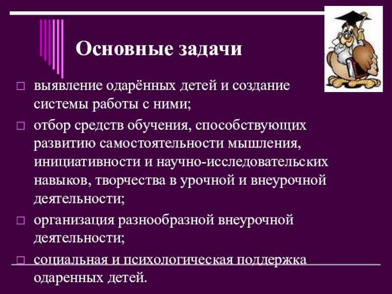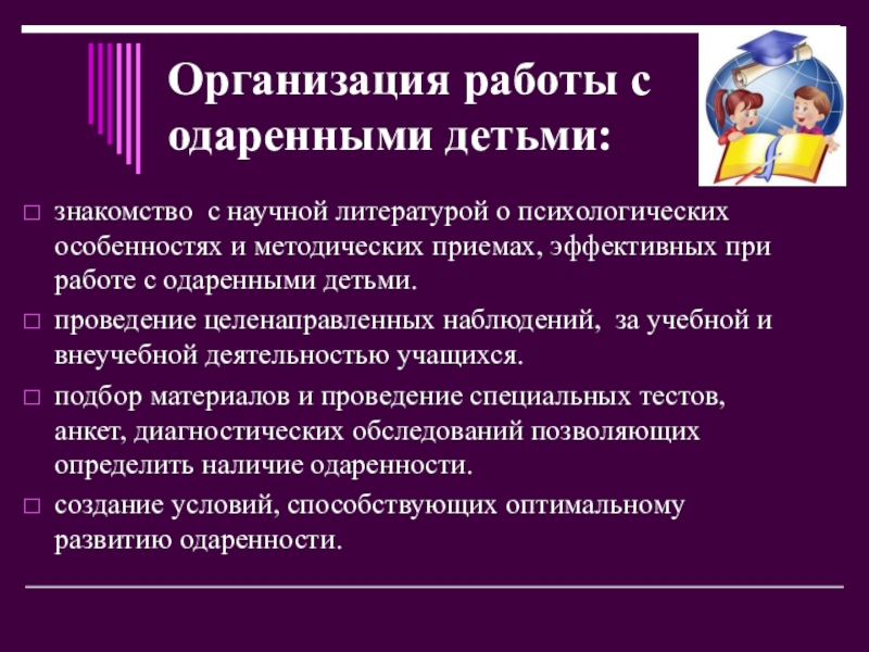 подбор материалов и проведение специальных тестов, анкет, диагностических обследований позволяющих определить наличие одаренности.
