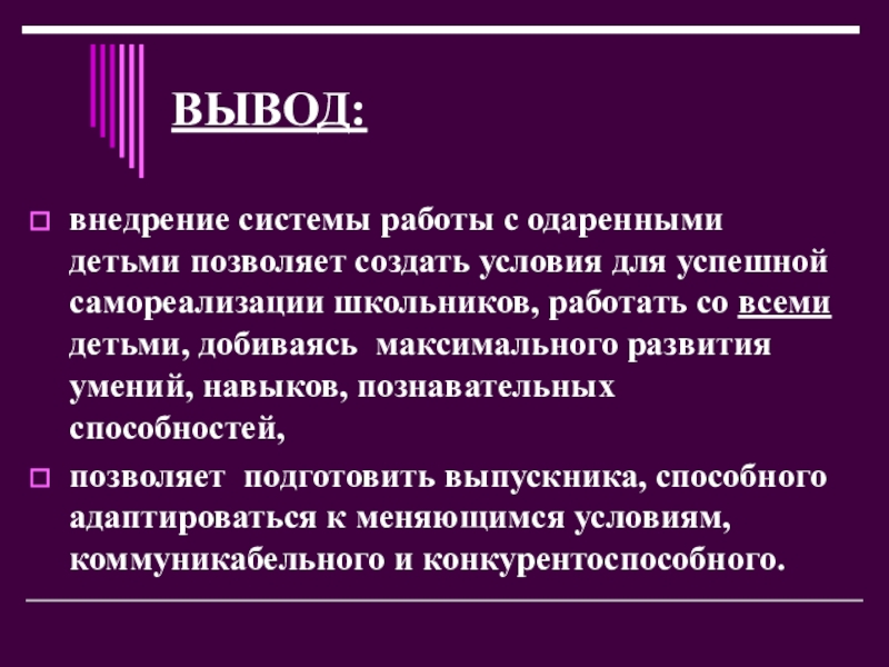 внедрение системы работы с одаренными детьми позволяет создать условия для успешной