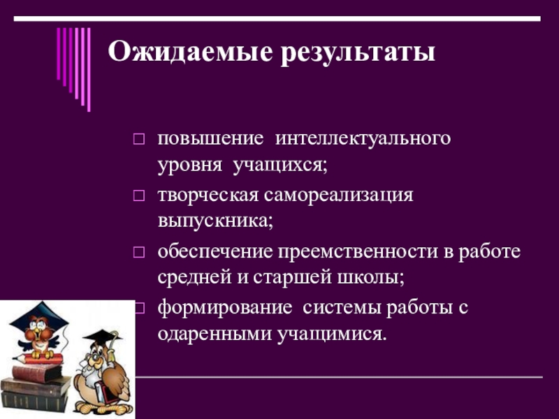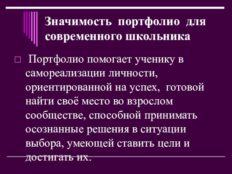 личности, ориентированной на успех, готовой найти своё место во взрослом сообществе, способной принимать осознанные решения в ситуации выбора, умеющей ставить цели и достигать их.