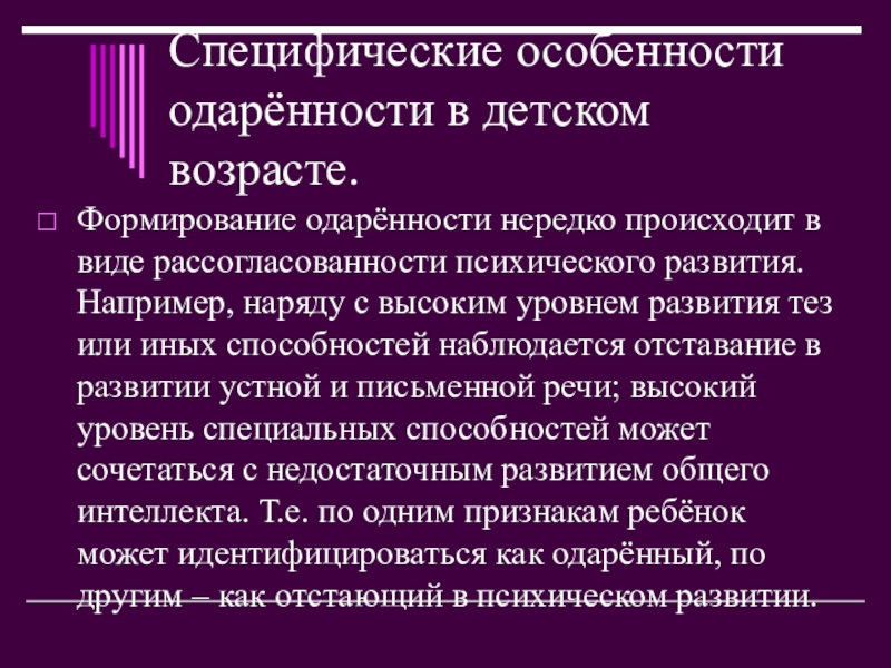 рассогласованности психического развития. Например, наряду с высоким уровнем развития тез или иных способностей наблюдается отставание в развитии устной и письменной речи; высокий уровень специальных способностей может сочетаться с недостаточным развитием общего интеллекта. Т.е. по одним признакам ребёнок может идентифицироваться как одарённый, по другим – как отстающий в психическом развитии.