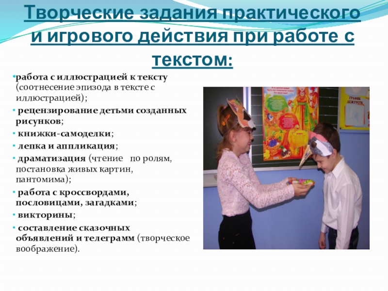 Слайд 5Творческие задания практического и игрового действия при работе с текстом: