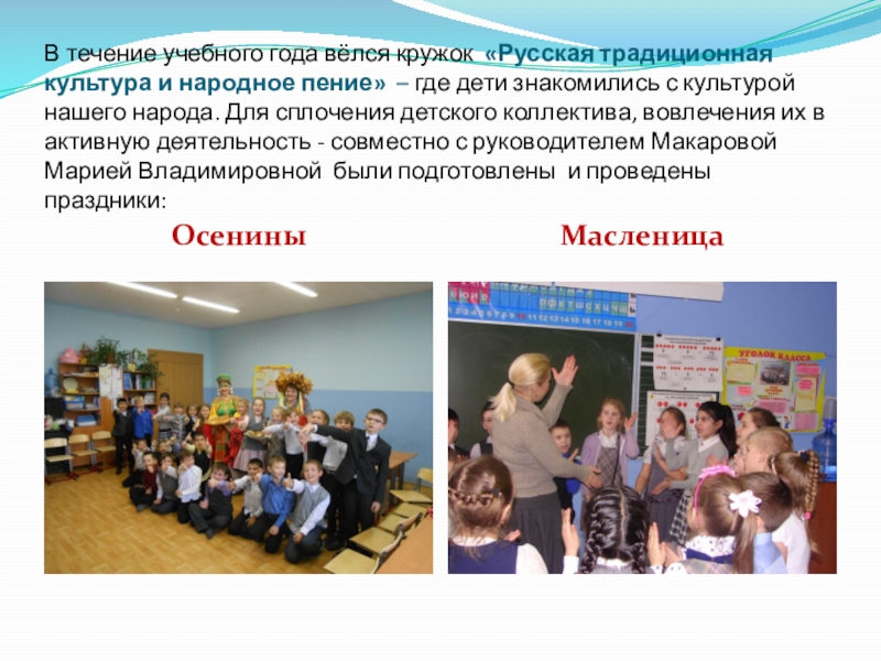 пение» – где дети знакомились с культурой нашего народа. Для сплочения детского коллектива, вовлечения их в активную деятельность - совместно с руководителем Макаровой Марией Владимировной были подготовлены и проведены праздники: