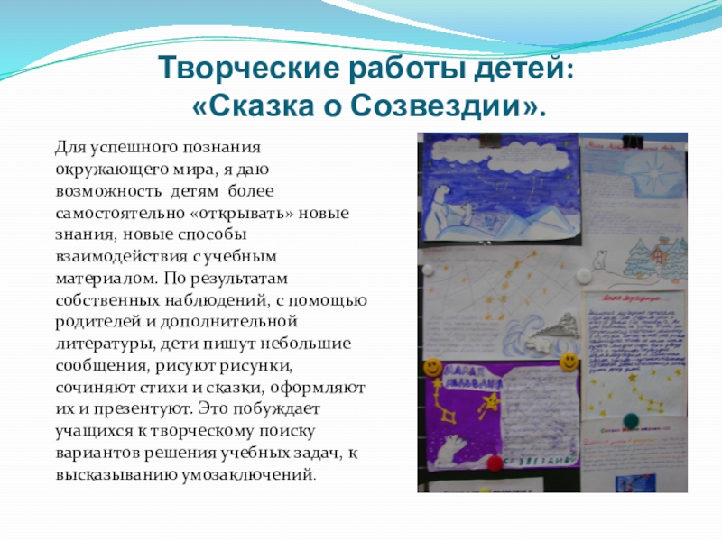даю возможность детям более самостоятельно «открывать» новые знания, новые способы взаимодействия с учебным материалом. По результатам собственных наблюдений, с помощью родителей и дополнительной литературы, дети пишут небольшие сообщения, рисуют рисунки, сочиняют стихи и сказки, оформляют их и презентуют. Это побуждает учащихся к творческому поиску вариантов решения учебных задач, к высказыванию умозаключений.