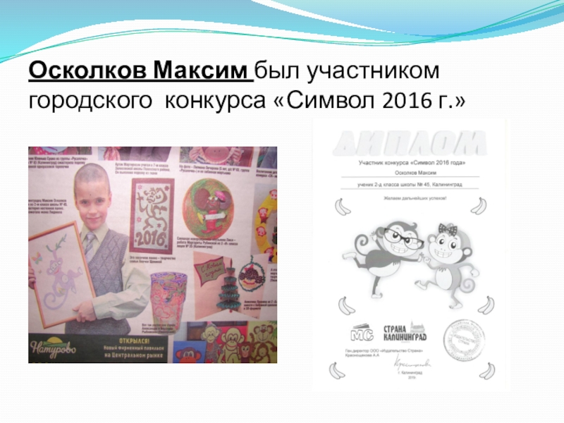 Слайд 19Осколков Максим был участником городского конкурса «Символ 2016 г.»