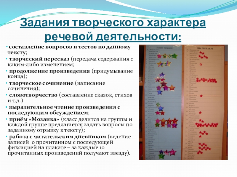 работа с читательским дневником (ведение записей о прочитанном с последующей фиксацией на плакате – за каждые 10 прочитанных произведений получают звезду).