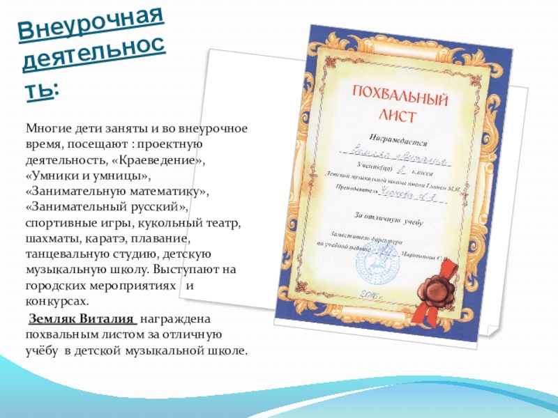 Земляк Виталия награждена похвальным листом за отличную учёбу в детской музыкальной школе.