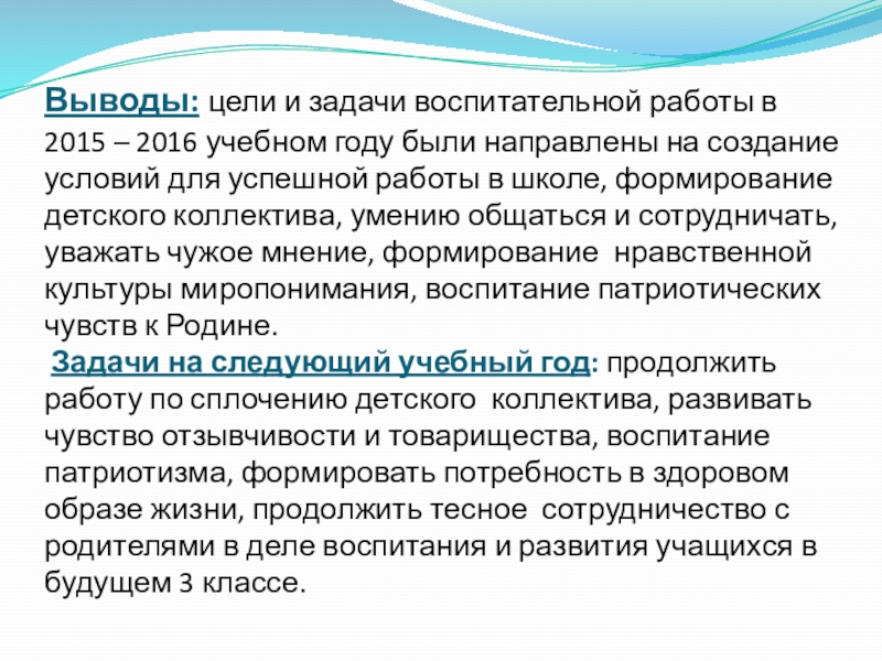Задачи на следующий учебный год: продолжить работу по сплочению детского коллектива, развивать чувство отзывчивости и товарищества, воспитание патриотизма, формировать потребность в здоровом образе жизни, продолжить тесное сотрудничество с родителями в деле воспитания и развития учащихся в будущем 3 классе.