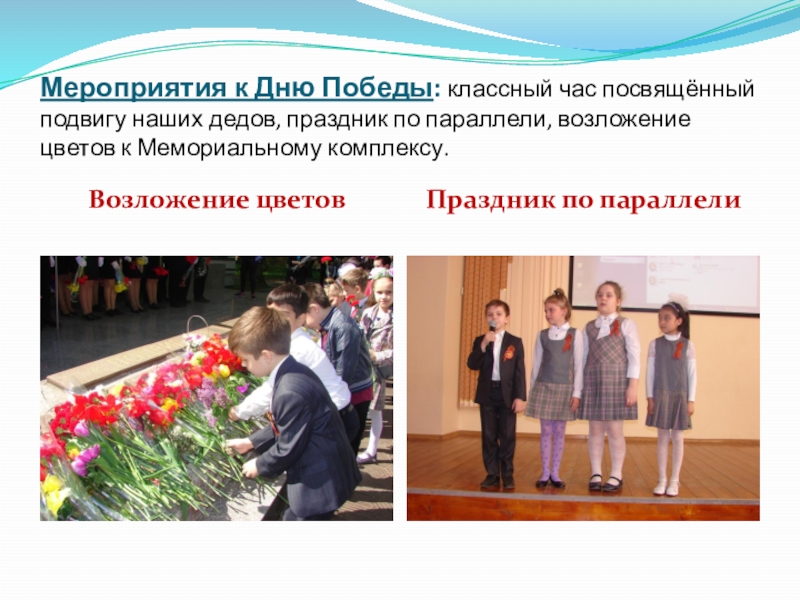 Слайд 16Мероприятия к Дню Победы: классный час посвящённый подвигу наших дедов, праздник