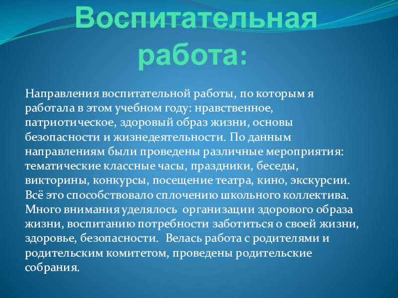 учебном году: нравственное, патриотическое, здоровый образ жизни, основы безопасности и жизнедеятельности. По данным направлениям были проведены различные мероприятия: тематические классные часы, праздники, беседы, викторины, конкурсы, посещение театра, кино, экскурсии. Всё это способствовало сплочению школьного коллектива. Много внимания уделялось организации здорового образа жизни, воспитанию потребности заботиться о своей жизни, здоровье, безопасности. Велась работа с родителями и родительским комитетом, проведены родительские собрания.