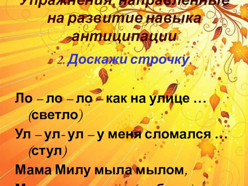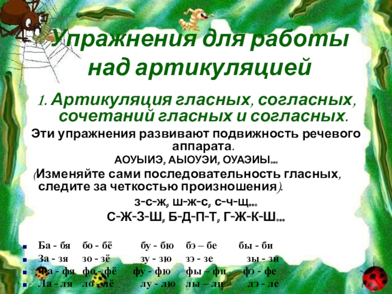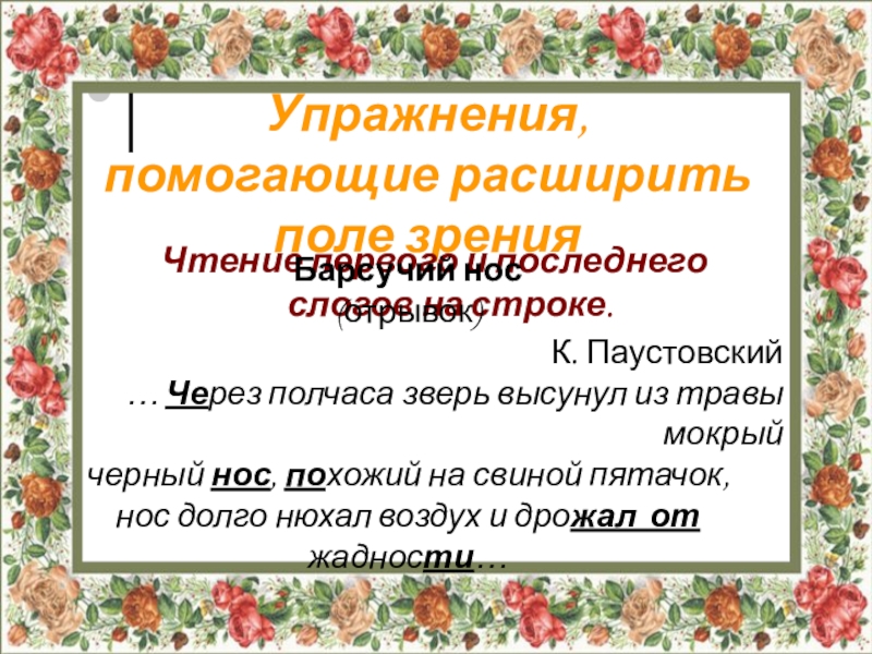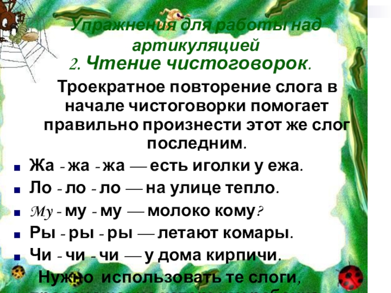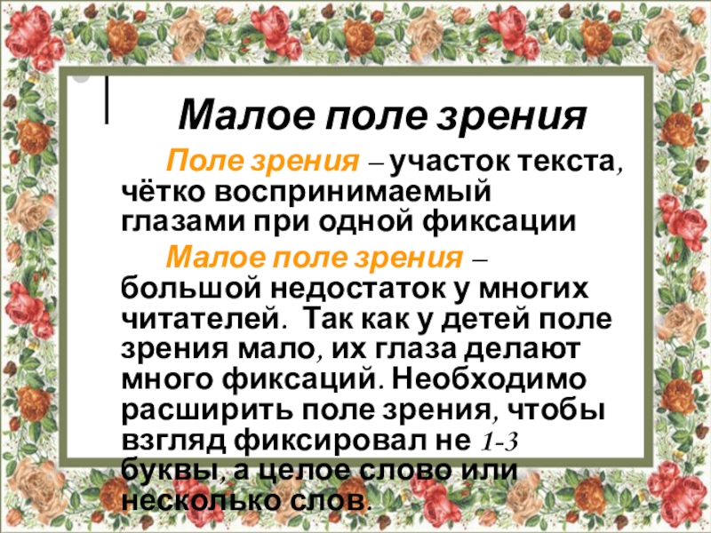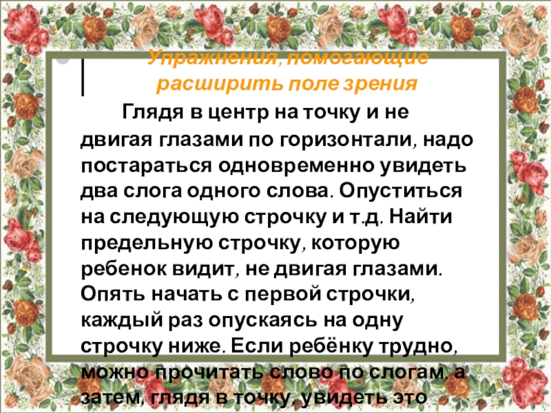 я кратко остановлюсь на каждой из этих причин и приведу примеры упражнений, помогающих устранить причины, тормозящие развитие и совершенствование технической составляющей процесса чтения.
