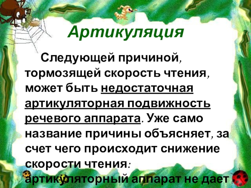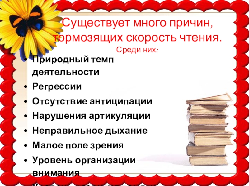 Слайд 16 Каждая из перечисленных причин может оказывать влияние на технику чтения. Далее