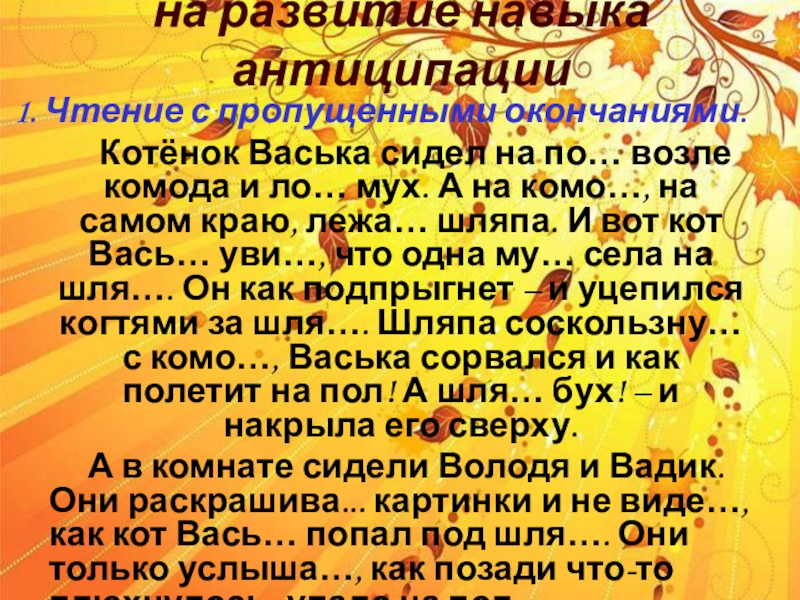 Часто можно наблюдать такую картину. Ребенок читает предложение, состоящее из 6-8 слов. Дочитав до третьего – четвертого слова – забыл первое слово. Поэтому он не может увязать все слова воедино. Необходимо в этом случае поработать над оперативной памятью.