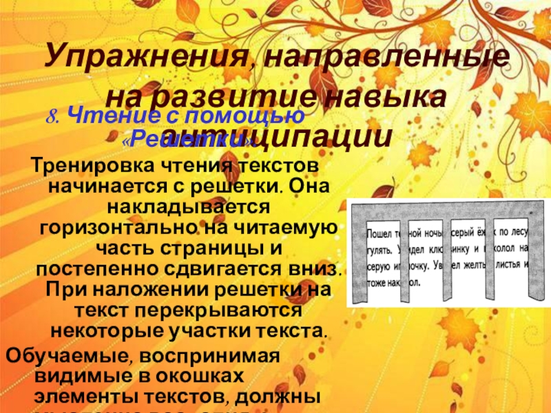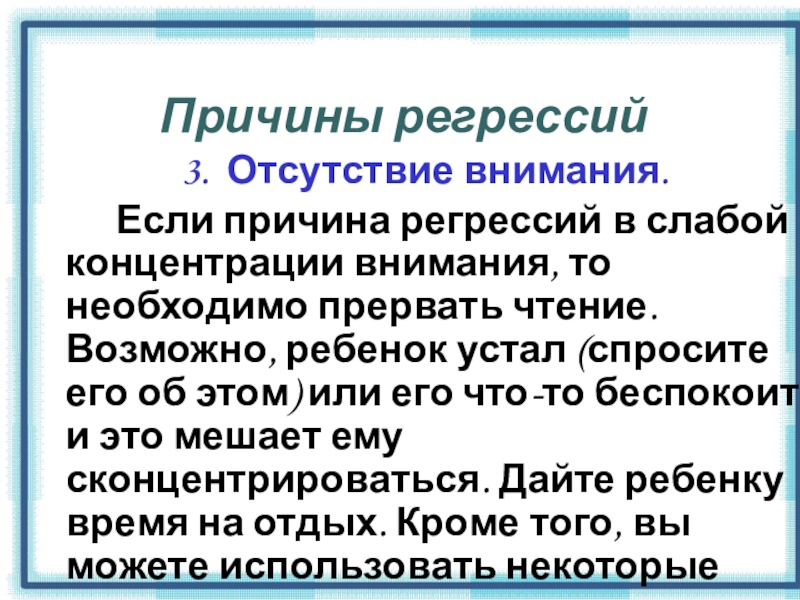 для понимания ребенка, то в этом случае предложите ему прочитать текст без регрессий, даже если отдельные места текста непонятны. Часто дальнейшее чтение снимает возможные вопросы и делает возвраты ненужными.