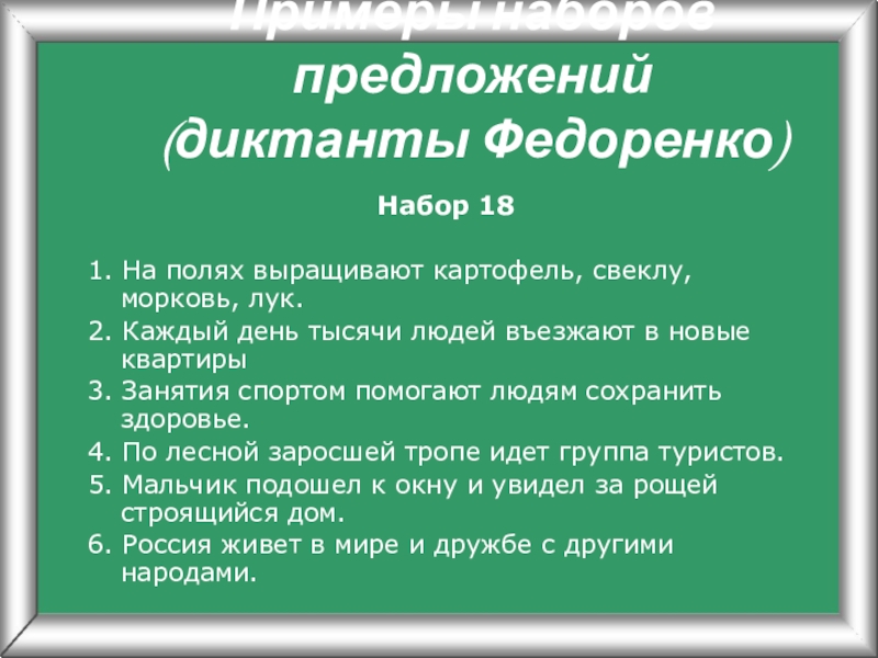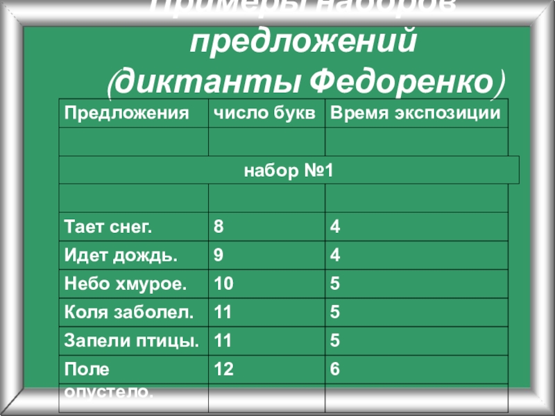 одного из наборов и завешиваются листом бумаги. После того, как одно из предложений высвечено, т.е. лист бумаги подвинут вниз, ребята в течение определенного времени /время указано для каждого предложения/ читают молча это предложение и стараются запомнить. По истечении времени учитель стирает предложение и предлагает ученикам записать его в тетради. Возможно, кто-то из учеников не запомнит, пусть перепишет у соседа. В следующий раз он постарается запомнить.