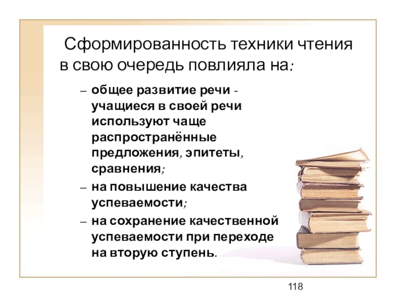 Слайд 118 Сформированность техники чтения в свою очередь повлияла на: