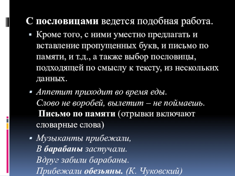 пропущенных букв, и письмо по памяти, и т.д., а также выбор пословицы, подходящей по смыслу к тексту, из нескольких данных.