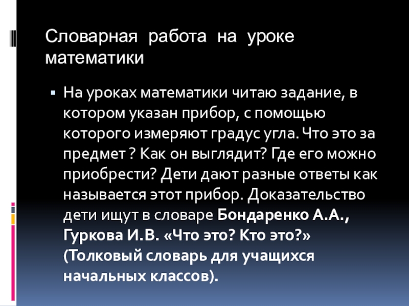 указан прибор, с помощью которого измеряют градус угла. Что это за предмет ? Как он выглядит? Где его можно приобрести? Дети дают разные ответы как называется этот прибор. Доказательство дети ищут в словаре Бондаренко А.А., Гуркова И.В. «Что это? Кто это?» (Толковый словарь для учащихся начальных классов).
